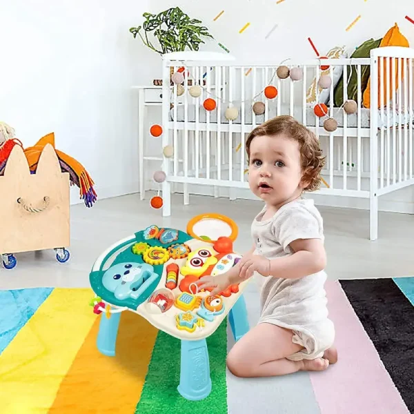 Masuța cu activități interactive este plină de jocuri și surprize, cum ar fi butoanele, luminițele și sunetele, care stimulează simțurile și încurajează explorarea creativă.