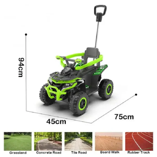 Copilul se urcă în șa și se ține de ghidon, iar părintele îl poate împinge și controla direcția folosind mânerul din spate. ATV-ul nu are pedale, deci este ideal pentru începători care învață să meargă pe roți în siguranță. Este perfect pentru plimbări în parc, pe trotuar sau în curte.