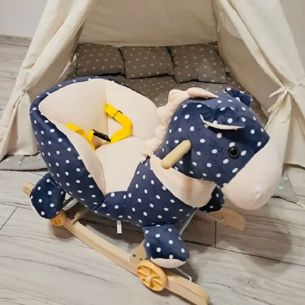 Oferă-i copilului tău ore de distracție și relaxare cu acest balansoar adorabil în formă de căluț albastru cu buline albe.