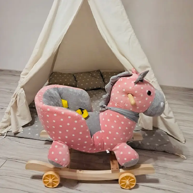 Fabricat din materiale moi și confortabile, acest căluț de pluș este dotat cu o centură de siguranță și sunete interactive, oferind siguranță și distracție pentru cei mici.