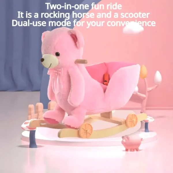 Cu un design 2-în-1, acest balansoar de pluș poate fi folosit atât ca scaun balansoar, cât și ca jucărie de plimbat, datorită roților incluse.