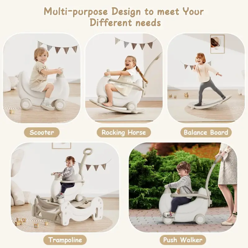Conceput pentru a îndeplini mai multe roluri, de la balansoar la cărucior de împins și chiar placă de echilibru, această jucărie aduce varietate și veselie în fiecare zi de joacă.