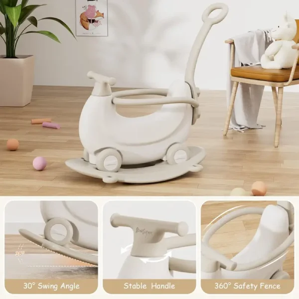 - Funcție de balansoar – Poate fi folosit ca un balansoar stabil, care îi oferă copilului o experiență sigură și plăcută de balansare, dezvoltându-i echilibrul.