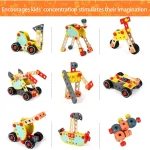 - Scule și accesorii: Această jucărie vine cu un set de scule și accesorii, precum șuruburi, șaibe, piulițe, chei și altele, pe care copiii le pot folosi pentru a asambla, dezasambla sau repara diferite obiecte.