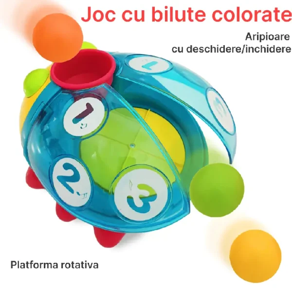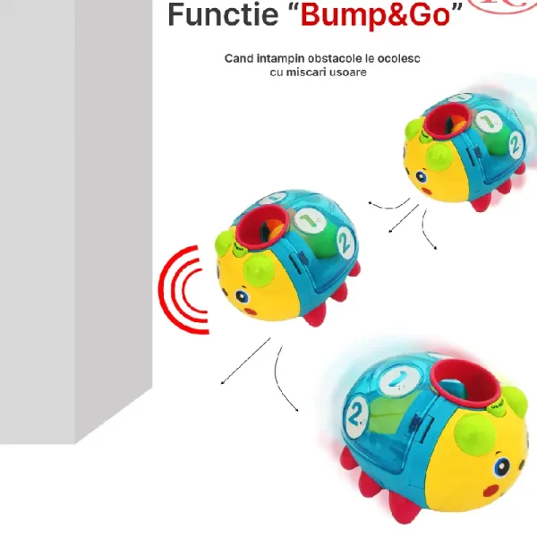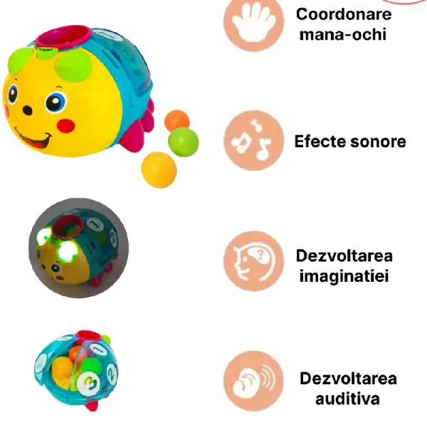 Această buburuză interactivă este concepută pentru a atrage atenția celor mici cu sunete vesele, lumini jucăușe și bile colorate.