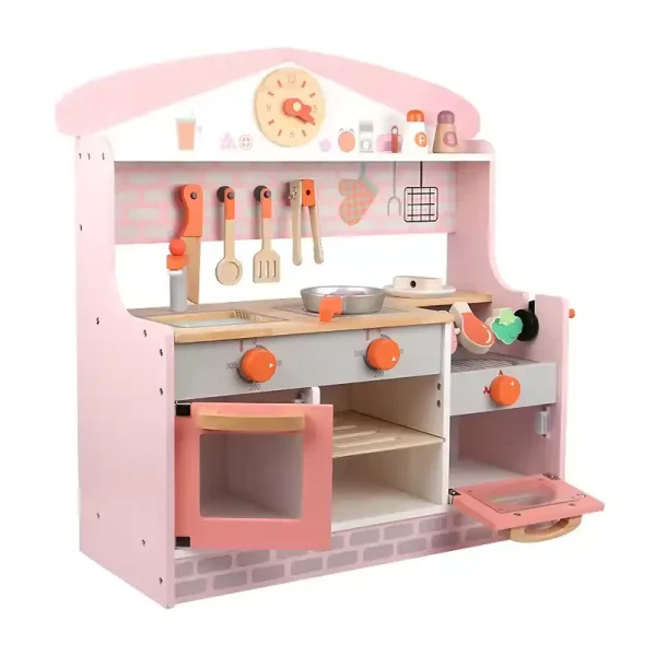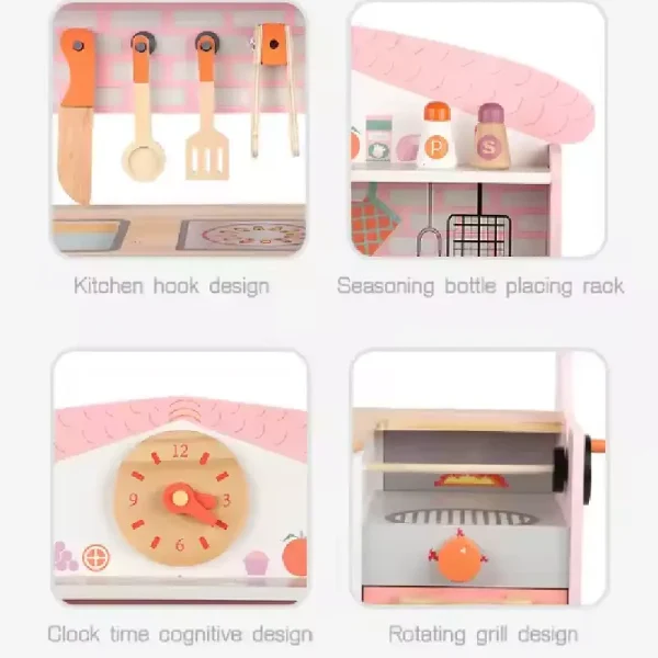 Fiecare detaliu este atent lucrat pentru a oferi o experiență educativă completă, de la ceasul decorativ care ajută copiii să învețe să citească ora, până la accesoriile de bucătărie din lemn care imită ustensilele reale.