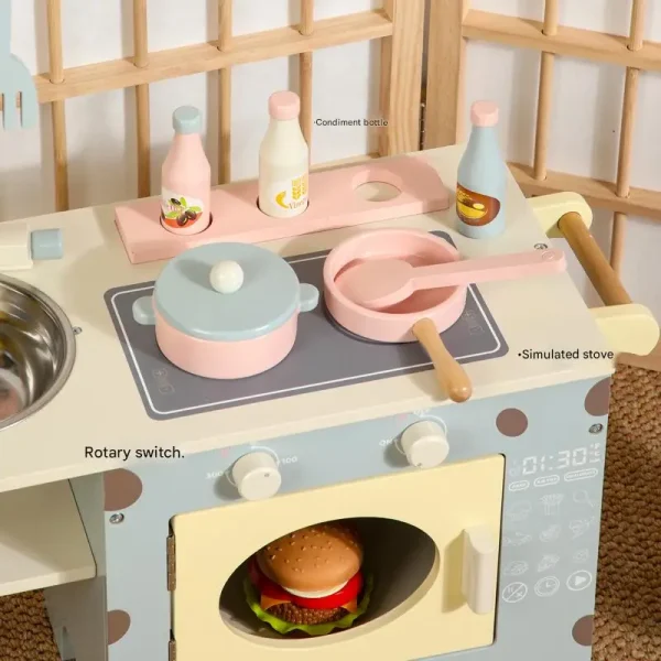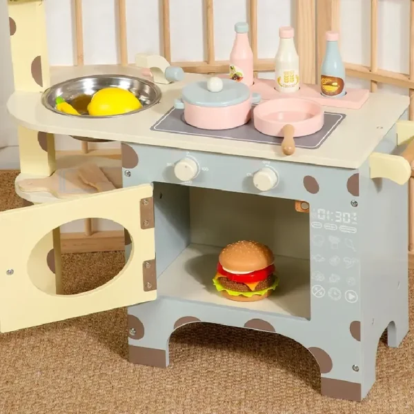 Cu un cadru solid din lemn, detalii pictate cu grijă și o girafă zâmbitoare ce „veghează” fiecare rețetă, această bucătărie stimulează creativitatea și joaca de rol.