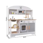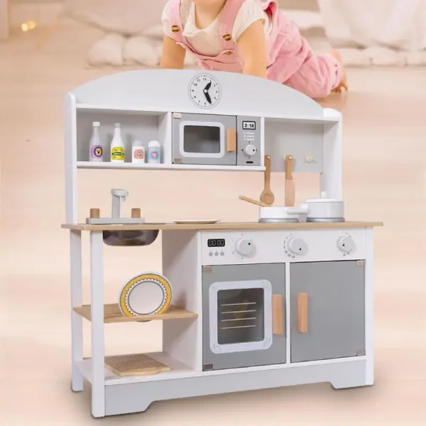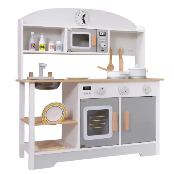 Cu un design modern, realist și funcțional, bucătăria include chiuvetă, cuptor, aragaz, rafturi și accesorii de gătit, fiind perfectă pentru a stimula creativitatea, coordonarea și abilitățile sociale ale micuțului tău.