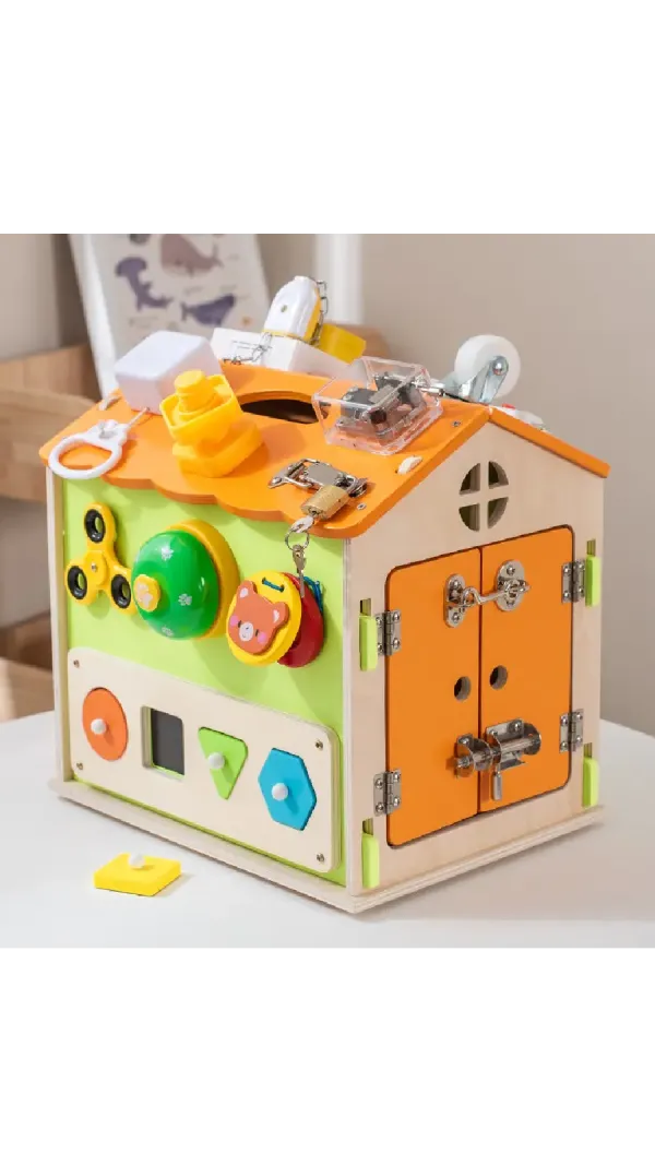 Busy Board Casuta cu Activitati Educative Montessori este o jucărie din lemn concepută pentru a stimula și dezvolta abilitățile motorii fine și creativitatea copiilor.