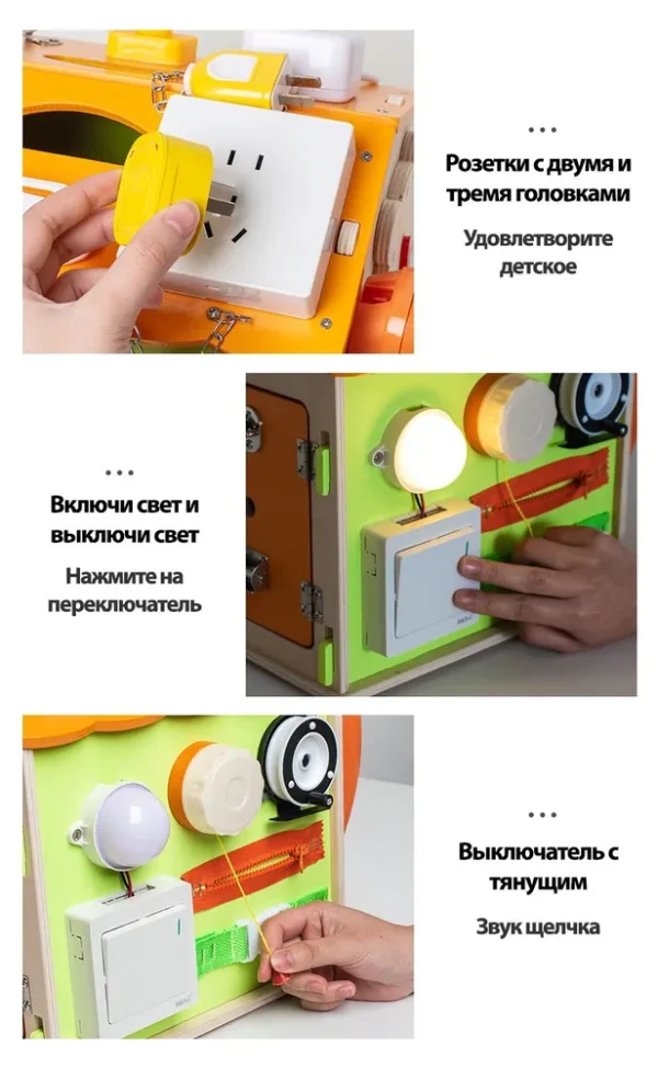 Busy Board Casuta cu Activitati Educative Montessori este prevăzută cu diverse activități interactivie, cum ar fi: