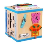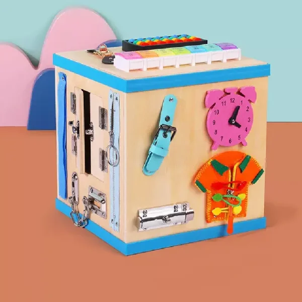 Busy Board Cub Educational Interactiv din Lemn are activități pe fiecare parte, ceea ce îl face extrem de interesant pentru copii.