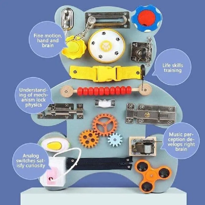 - Design tematic cu ursuleț: Busy Board-ul are un design tematic cu un ursuleț , ceea ce îl face atrăgător și familiar pentru copii.