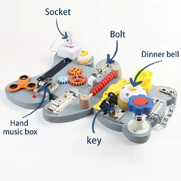 - Dezvoltarea timpurie a abilităților cognitive: Prin activitățile de pe Busy Board, copiii pot învăța concepte matematice simple, precum potrivirea formelor sau închiderea și deschiderea.
