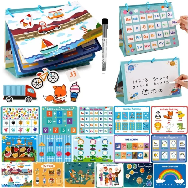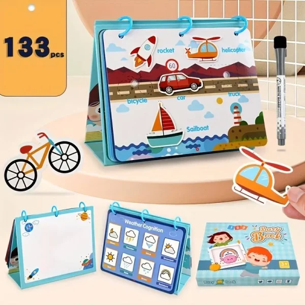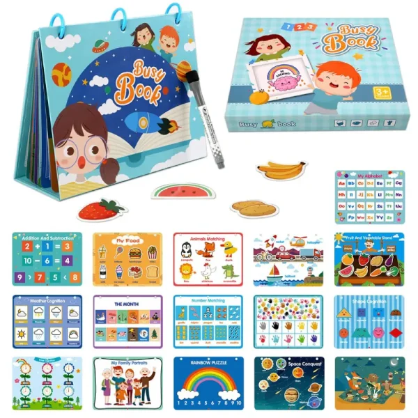 Busy Book cu activități Montessori pentru grădiniță este o jucărie educativă și interactivă care conține mai multe pagini sau activități diferite, concepute pentru a ajuta copiii să învețe și să dezvolte o varietate de abilități și cunoștințe.