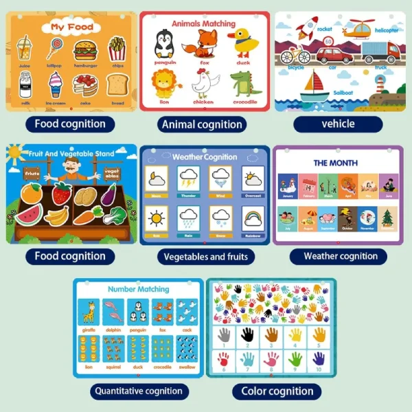 Alfabet, tablă albă, alimente, animale, vehicule, legume și fructe, vreme, luni, culori, forme, ceasuri, numere, planete, membri ai familiei, puzzle-uri cu animale, adunări și scăderi, puzzle curcubeu. Include, de asemenea, 3 pixuri acuarela in pachet pentru a le folosi pe tabla alba a busy book-ului.