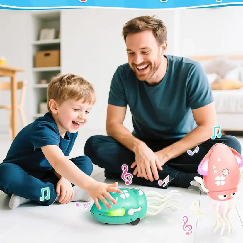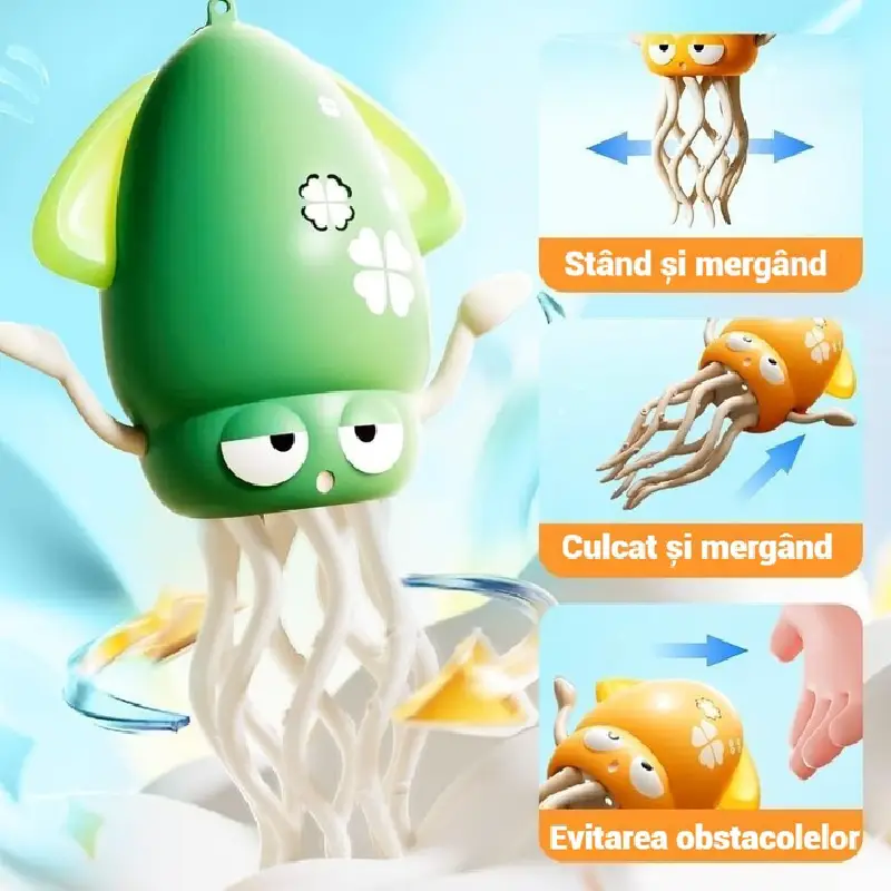Cu tentacule care se mișcă haotic, melodii vesele și lumini colorate, această jucărie interactivă captivează atenția instant.