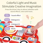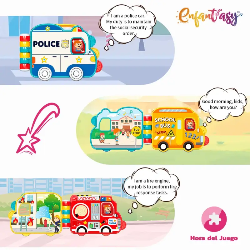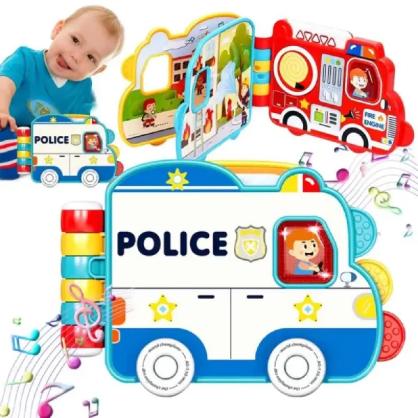 Apasă butoanele cu simboluri – copilul va auzi sirena pompierilor, claxonul poliției, vocea soferului de pe autobuzul scolar.