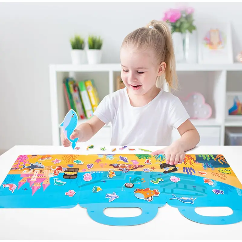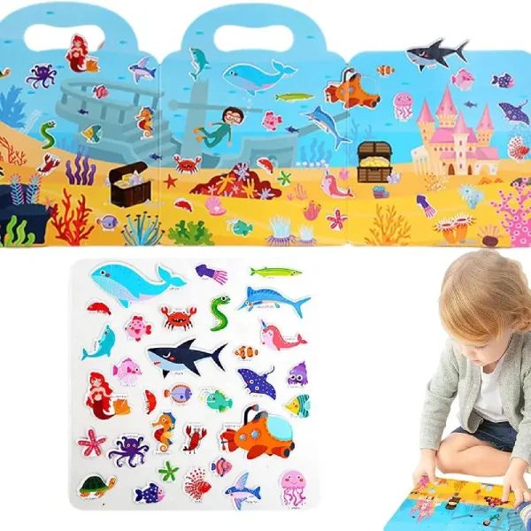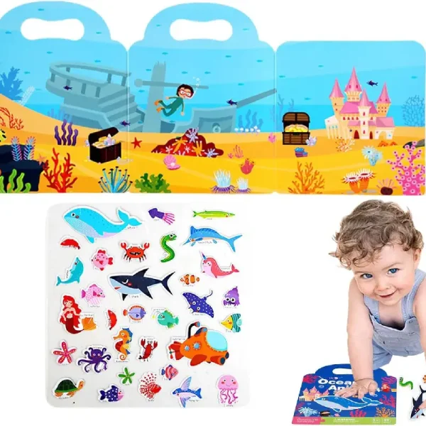 Fiecare pagină a cărții reprezintă un puzzle magnetic distinct, oferind copiilor oportunitatea de a explora și de a învăța despre diverse animale marine, precum delfini, rechini, stele de mare și multe altele.