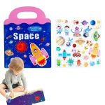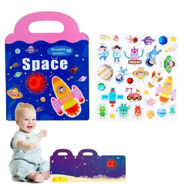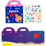 Carte Montessori Puzzle Magnetic cu Spatiul Cosmic contine 30 stickere reutilizabile.