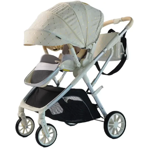 - Design Elegant și Modern: Căruciorul impresionează prin designul său rafinat, cu accente aurii și finisaje de calitate superioară.