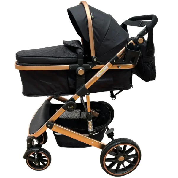 - Include compartiment de depozitare pentru a putea transporta ușor și organizat diferite obiecte necesare pentru copil, cum ar fi scutece, haine de schimb, jucării sau sticle cu apă,precum si o geanta.