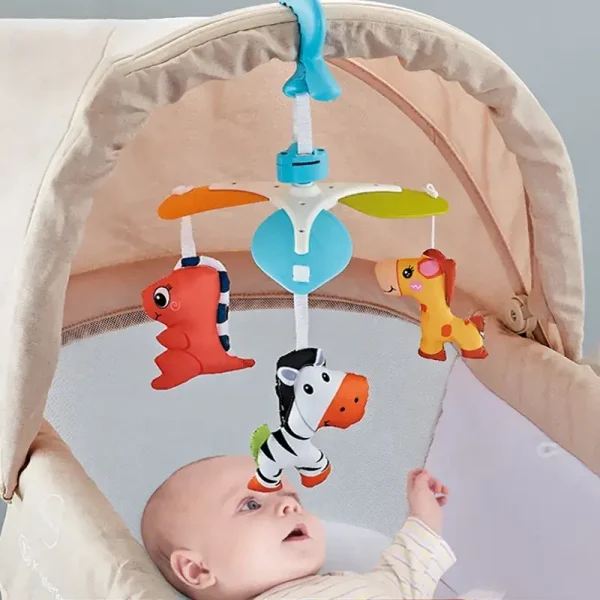 Jucăria mobilă este dotată cu figurine ușor de recunoscut, precum girafe, zebre sau dinozauri, fiecare realizată din materiale sigure și moi.