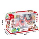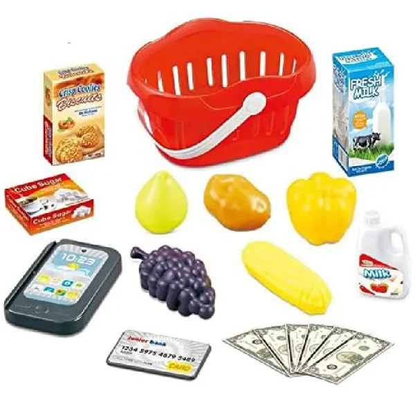 Setul include o casă de marcat cu butoane și sertar de bani, un scanner de produse cu sunete realiste, un coș de cumpărături cu fructe și legume, card de credit și bancnote de jucărie.