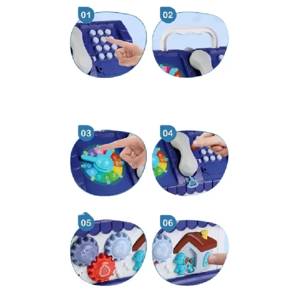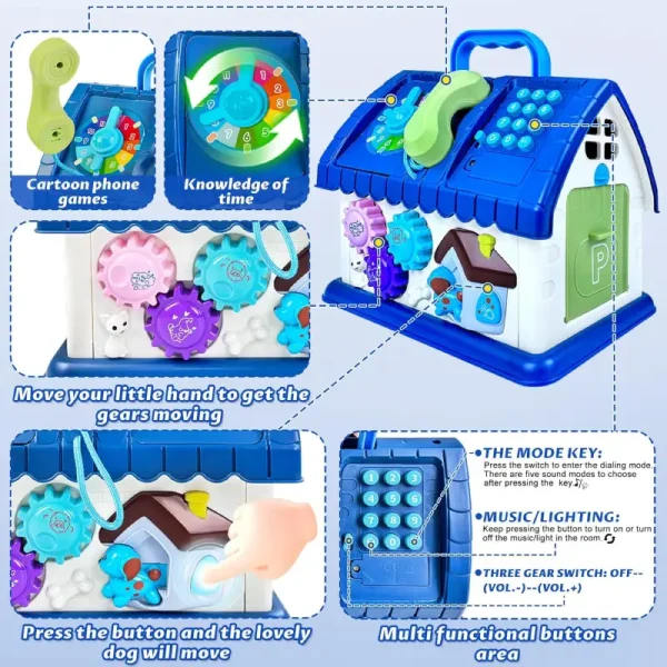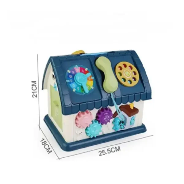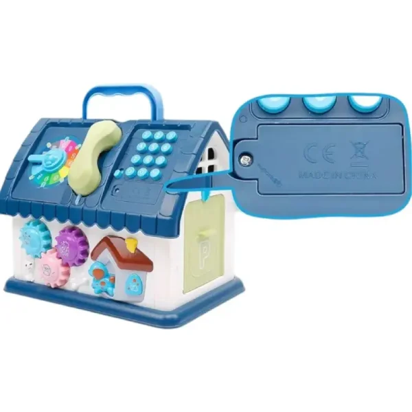Această căsuță este plină de activități distractive și educative: un telefon, ceas colorat, roți dințate care se învârt, butoane numerotate și multe alte funcții interactive.