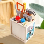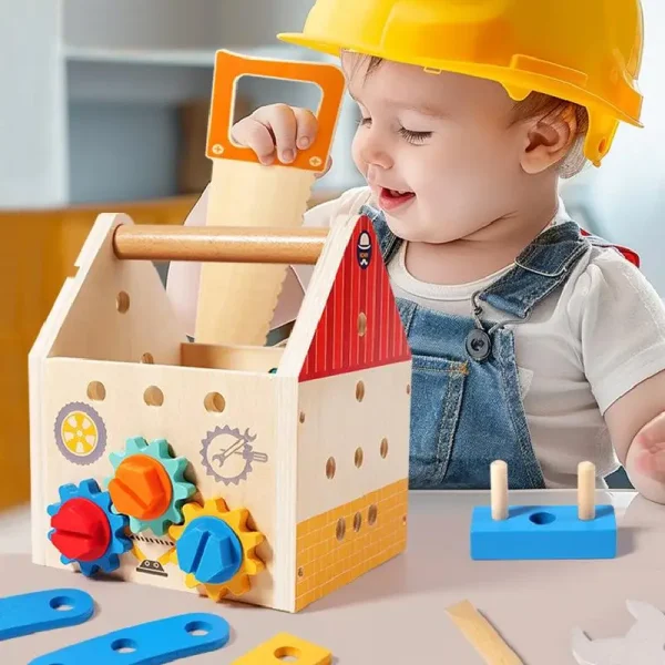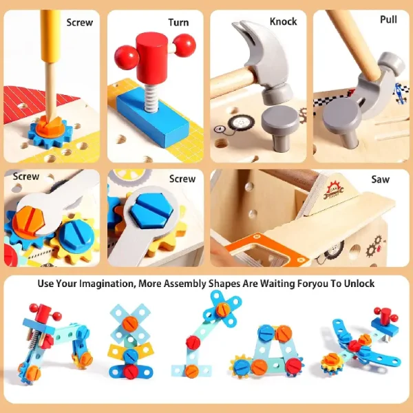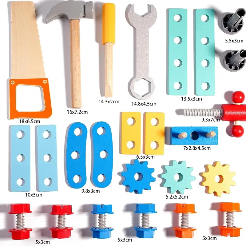 Construită din lemn natural, rezistent și finisat cu vopsele non-toxice, jucăria este 100% sigură pentru cei mici. Include multiple accesorii: ciocan, cheie, ferăstrău, șurubelniță, piulițe, roți dințate și panouri cu încuietori, totul într-un design simpatic și viu colorat, care atrage instant atenția copiilor.