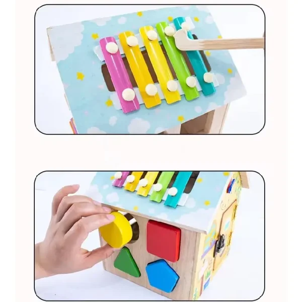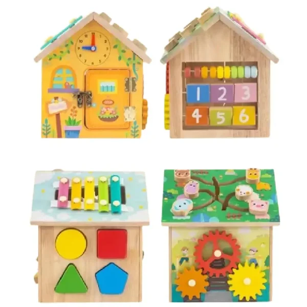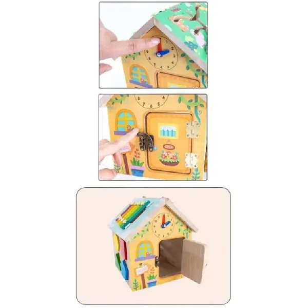 Cu un design adorabil de căsuță, această jucărie educativă oferă 8 activități interactive: roți dințate colorate, ceas cu limbi mobile, încuietori Montessori, feronerie funcțională, jocuri cu animale, labirint, xilofon, abac și două figurine din lemn.