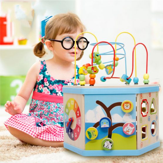 Centru activitati din lemn educativ 8 in 1, un centru de joaca sub forma de hexagon cu 8 fatete cu activitati educative pentru copii cu varsta intre 1 an – 6 ani.