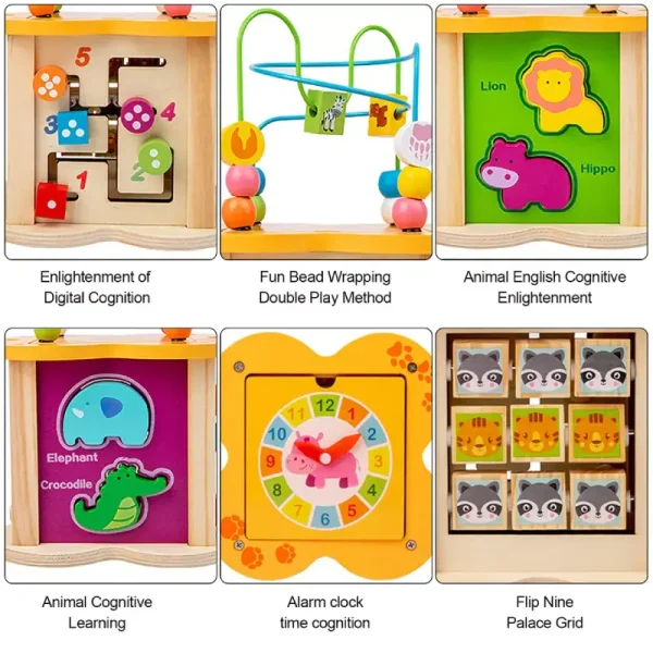 Cu un design atractiv și culori vibrante, centrul include multiple activități educative, cum ar fi labirint cu bile, puzzle-uri tridimensionale, forme geometrice de sortat, blocuri cu animale și roți învârtitoare, toate integrate pe diferite laturi ale cubului.