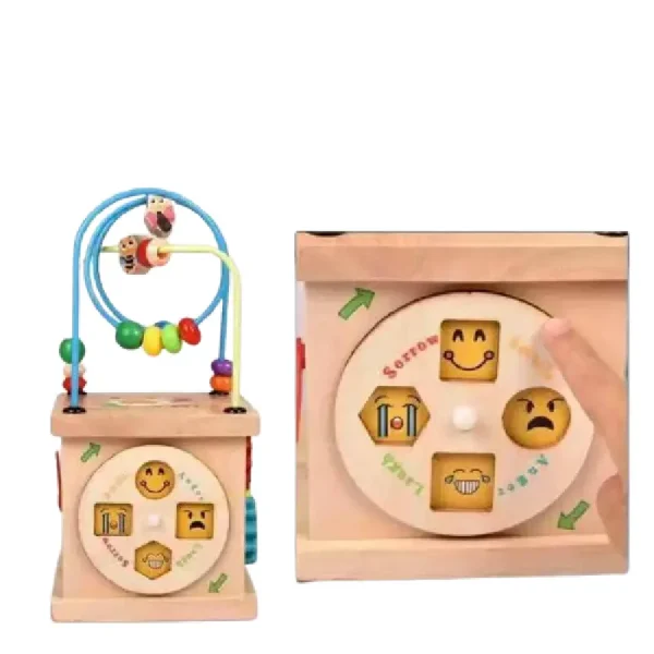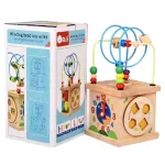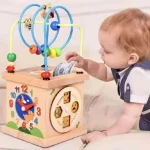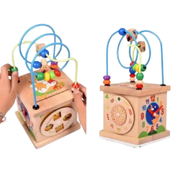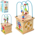Fabricat din lemn de înaltă calitate, acest cub oferă o gamă variată de activități stimulative, inclusiv trasee cu bile, puzzle-uri cu forme și animale, și jocuri de potrivire.