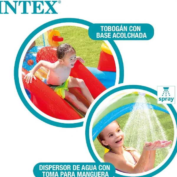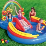 Nu este doar o piscină – este o insulă de distracție, cu tobogan, curcubeu, stropitoare, inele de aruncat, mingi colorate și râsete fără pauză.