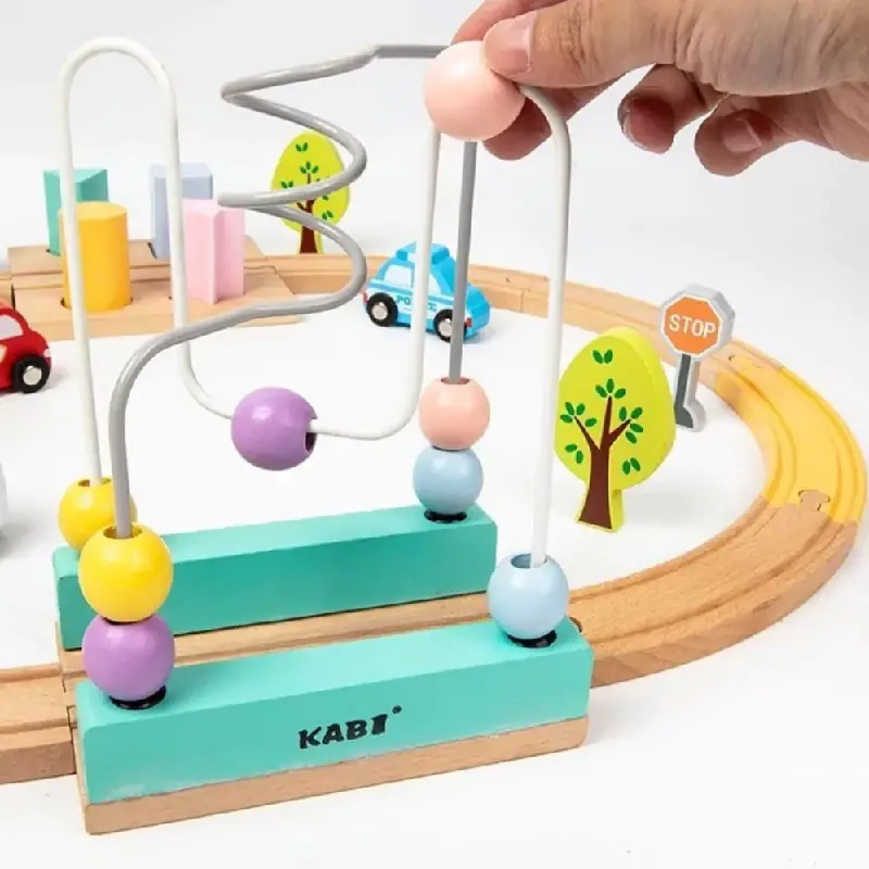 Circuit cu Masinute si Trenulet din Lemn Kabi este o jucărie complexă și educativă, creată pentru a stimula dezvoltarea cognitivă și motorie a copiilor.
