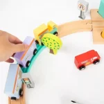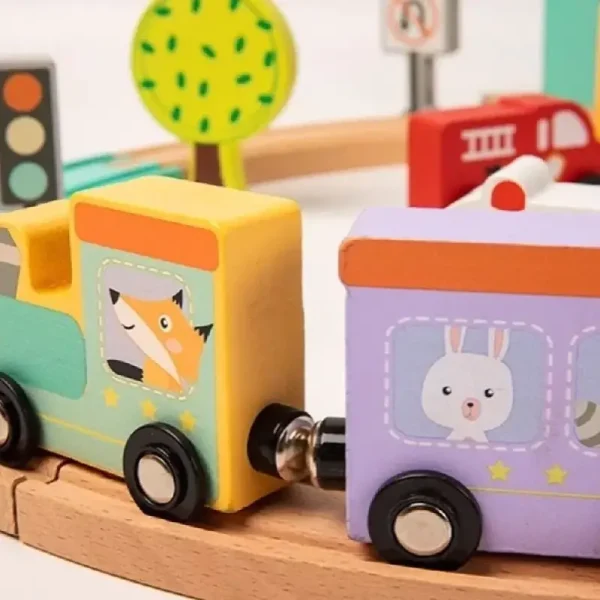 Construirea pistei: Copilul poate începe prin asamblarea pistei de tren din piesele din lemn, dezvoltându-și abilitățile de rezolvare a problemelor.