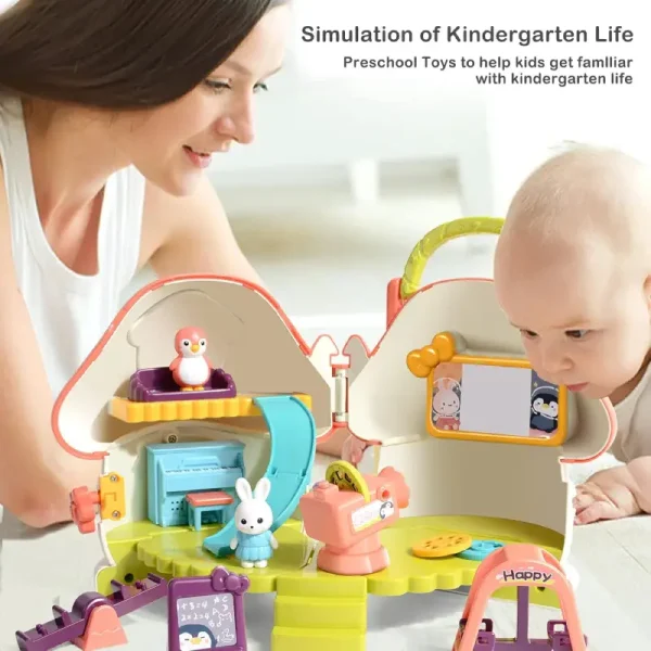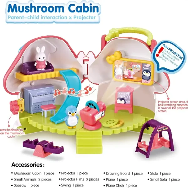 Această căsuță include un proiector captivant pentru vizionarea de imagini și povești interactive, animăluțe simpatice, tobogan, leagăn, pian și multe alte accesorii.