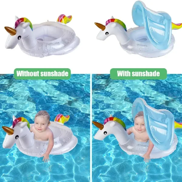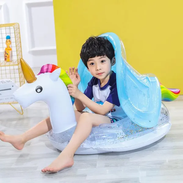 Colac Unicorn cu Parasolar pentru Bebelusi este accesoriul perfect pentru zilele insorite de la piscina sau de la mare.