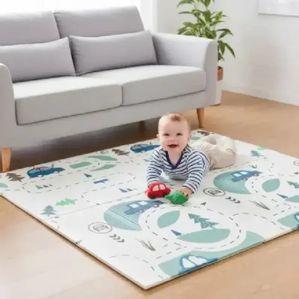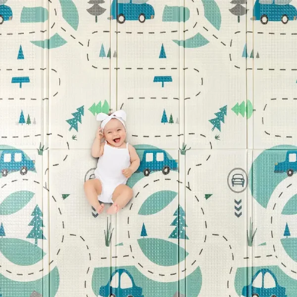Explorare liberă: bebelușul poate urmări cu degetele drumurile cu mașinuțe, stimulând motricitatea fină.
