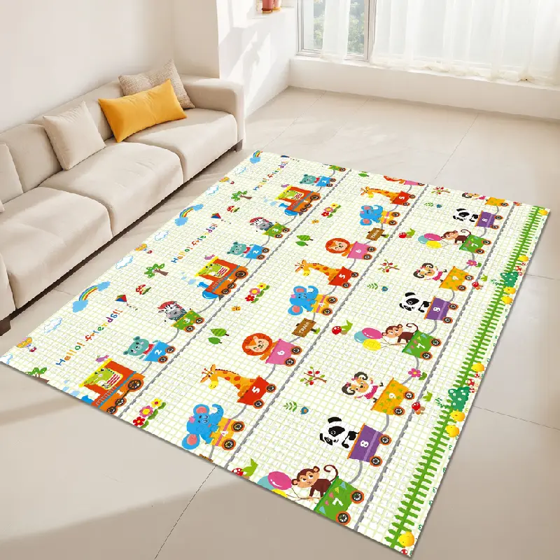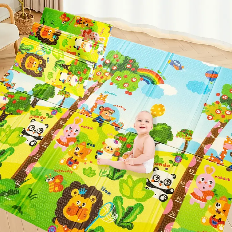 Textura moale protejează la căderi, iar imprimeurile colorate ajută la stimularea vizuală și cognitivă.