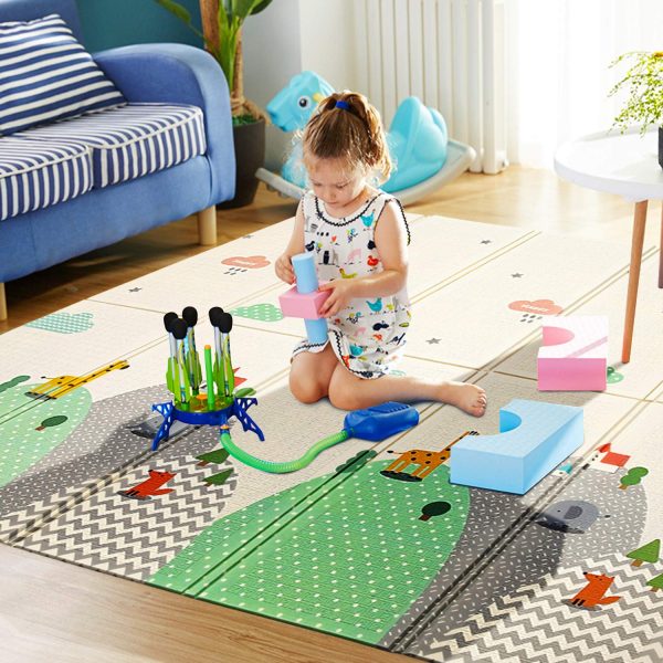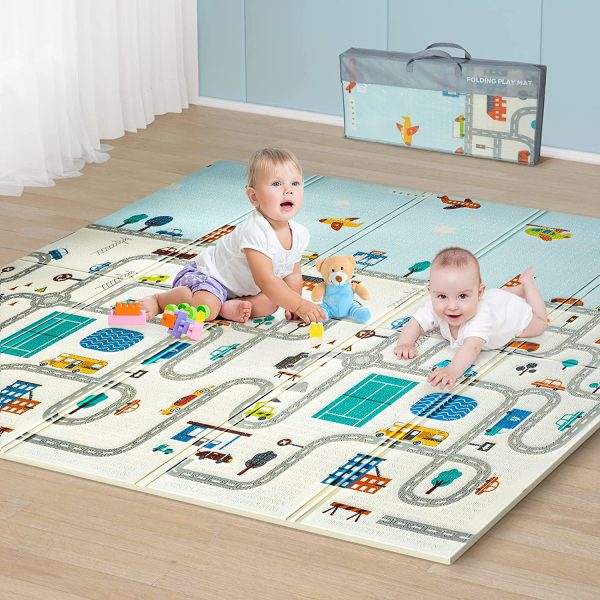 Cu cele două fețe reprezentând un oraș și un satuc, copiii pot explora diferite scenarii de joc. Ei pot să creeze povești, să-și imagineze aventuri și să-și dezvolte imaginația în timp ce interacționează cu acest covor versatil.