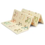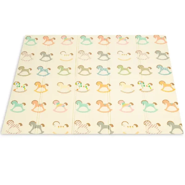 Cu două fețe diferite, decorate cu imprimeuri vesele – ursuleți, căprioare și căluți de jucărie – covorașul transformă orice cameră într-un loc de joacă magic.