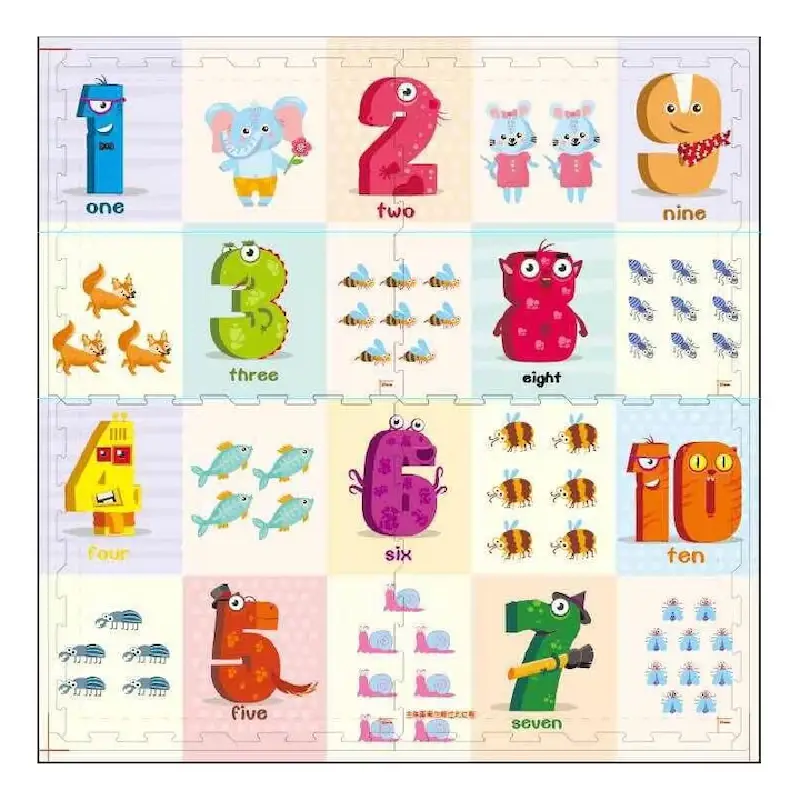 Cu un design viu colorat, care include cifre, animale și forme atrăgătoare, această salteluță este ideală pentru a stimula învățarea și creativitatea celor mici.