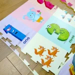 Aceasta este o salteluță puzzle pentru copii, decorată cu imagini colorate și educative, perfectă pentru învățare și joacă