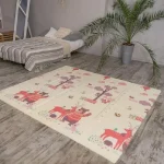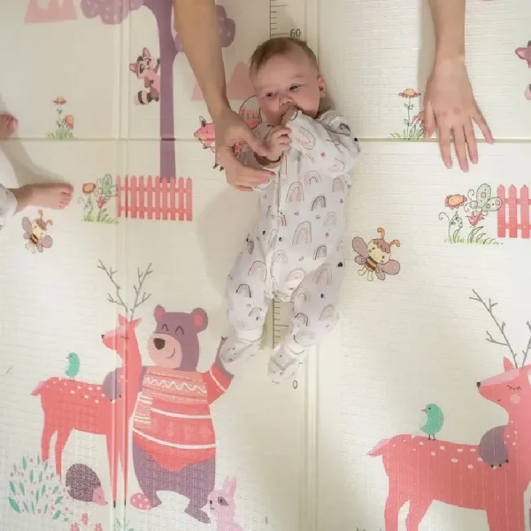 Designul este adorabil și calm, cu ursuleți, vulpițe, copăcei și o riglă imprimată pentru a măsura înălțimea copilului direct pe covor. Covorașul este reversibil, ușor de curățat și perfect atât pentru camerele copiilor, cât și pentru living.