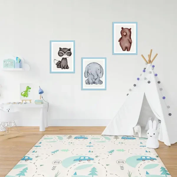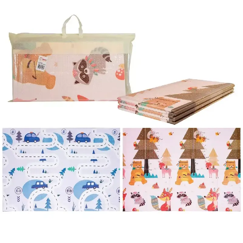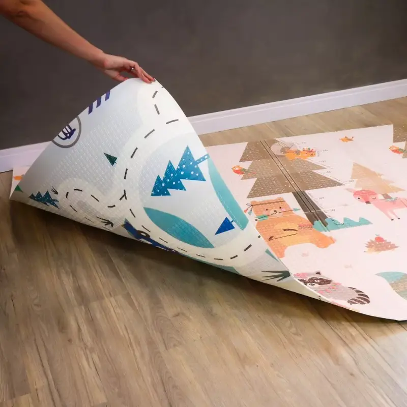 - Design Dublu: O față a covorașului este decorată cu sosele și mașinuțe, stimulând creativitatea și jocurile de rol, în timp ce cealaltă față prezintă imagini vesele cu animăluțe, captivând atenția micuțului tău.