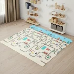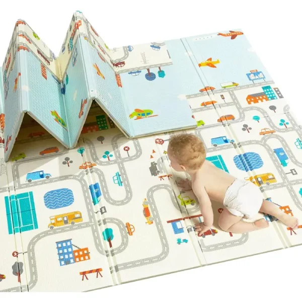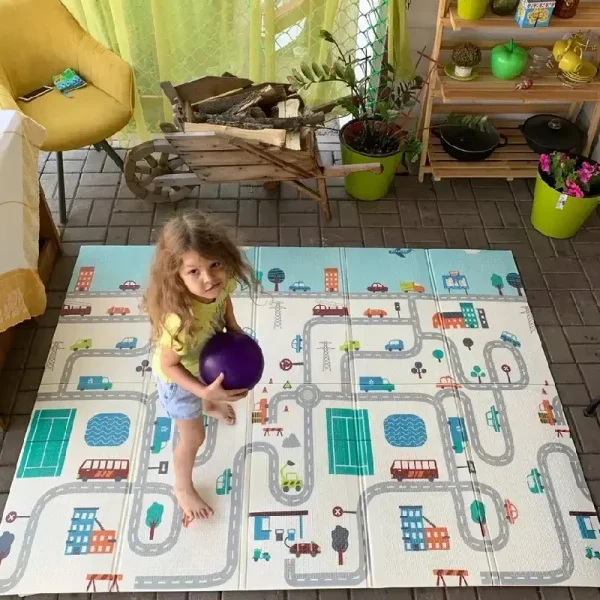 - Covorul poate fi pliat, ceea ce il face ușor de transportat și depozitat. Aceasta este o caracteristică convenabilă pentru părinți, deoarece poate fi utilizat acasă sau luat cu ei în călătorii și excursii.