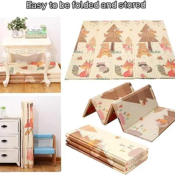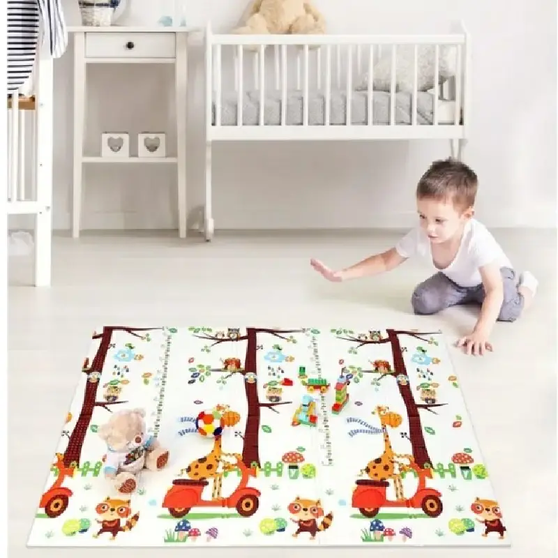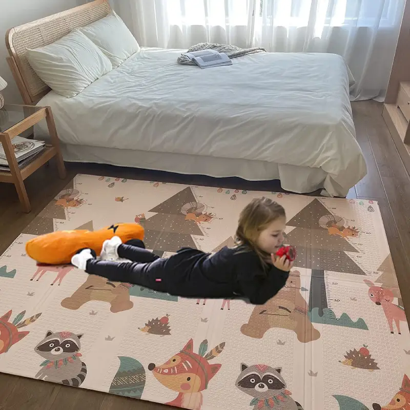 Covorul pliabil are doua fete,material impermeabil XPE ,imprimat,de dimensiuni mari : 180 cm x 200 cm .