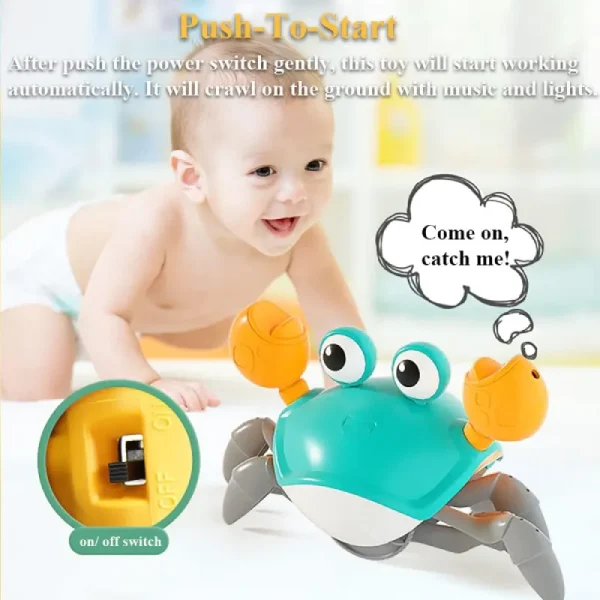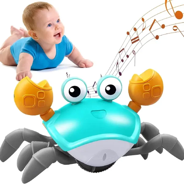Crabul colorat, cu ochi mari, atrage atenția bebelusilor, chiar și atunci când cei mici nu pot inca merge.