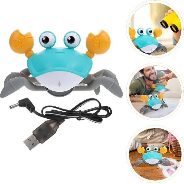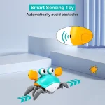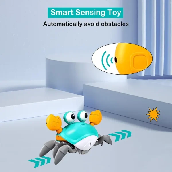 Crabul nostru cu un sensor inteligent incorporat face jucaria sa se miste atunci cand te apropii de ea si este setat ca atunci cand intalneste un obstacol,sa se deplaseze in directia opusa obstacolului, are capacitatea de a evita sa ramana blocat sub mobilier sau in jurul picioarelor mesei si a scaunelor.